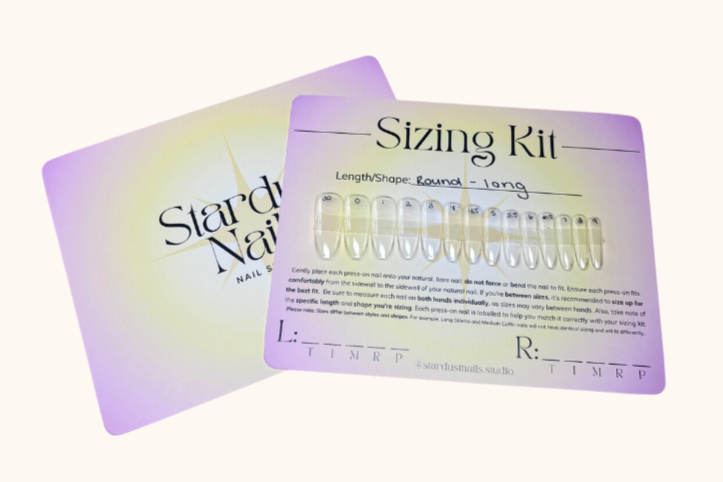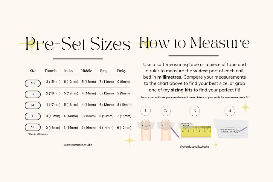 Select a preset size. These are also listed as common nail sizes, and fit most nail beds. Please be mindful that not all nail artists use the same size guide.